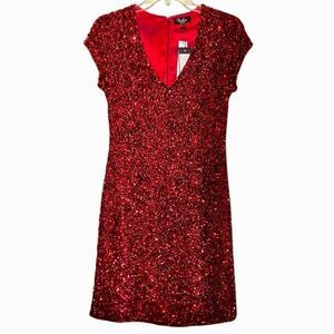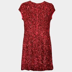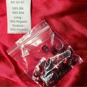 This NWT sequined and beaded silk dress has cap sleeves and a back zipper with hook and eye closure. The dress is fully lined.