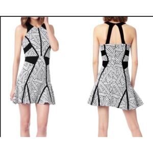 Parker Black White Geometric Textured Fitted Mini Dress Flounce Skirt