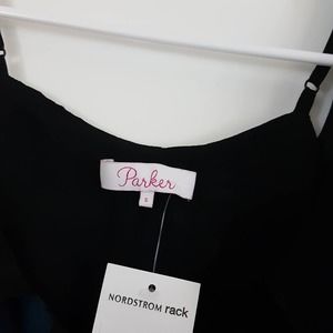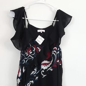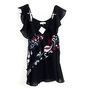 Elegant black blouse with red and white floral design. Features ruffled sleeves and a flowing silhouette.