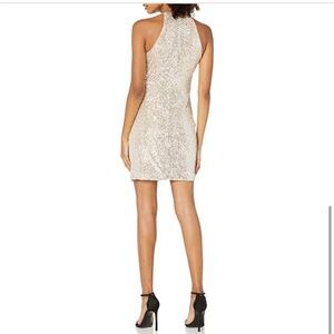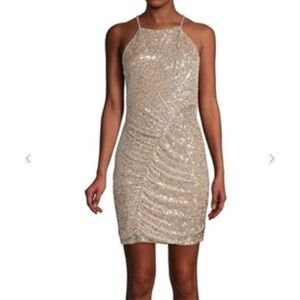 Parker Black, Stunning champagne sequin dress. Sleeveless halter design for elegance.
