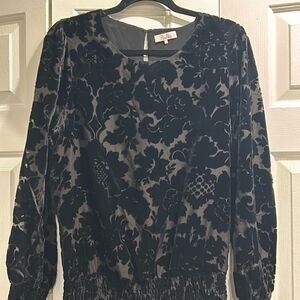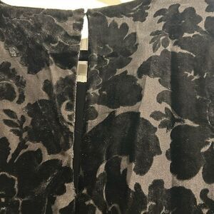 Parker Black Mixed Fabric Dress, Size Large. Sleeves are elastic. Elastic waist band which allows the top of the dress to blouse over the skirt. Dress is lined. Pattern has a velvet feel to it. Excellent condition