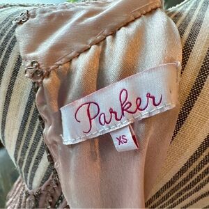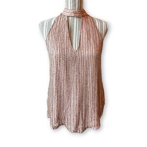 Parker halter top with choker neckline, deep V cutout + keyhole back. Blush-mauve satin with rose-gold sheen, embellished with sequins + beads. Like new — a few sequins missing (see photo), but extras included.