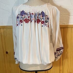 Pretty white boho top with colorful floral embroidery detail. Elastic at the cuffs, neckline and hem. Neckline has a hook and eye closure and tassel ties. In excellent like new condition. No stains or holes. Approximate measurements laying flat: bust 20” across from armpit to armpit, sleeves 21” and length 21”.