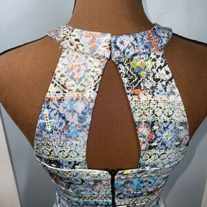 Multicolor neon geometric geo Aztec tribal Navajo print white lace overlay drop waist fit & flare sleeveless high neck halter boho party mini dress. Fully lined. Mini ladder cutout trim. Back cut-out with hook & eye closure. Hidden back zipper closure.