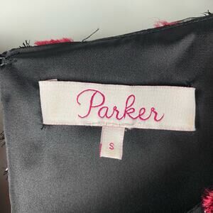 Parker Carmindy womens dress in black. Red floral velvet burnout on black. Round neck, blouson sleeves and bodice. Stretch-smocked cuffs and drop waistband. Mini length. Back button keyhole, partially lined, pullover style. Designed for a contemporary fit. Size small. Excellent used condition. No flaws detected. See measurements for proper fit.