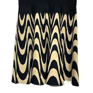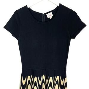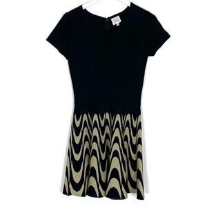 Short sleeved dress with black bodice and printed skirt. Zips in back. Rayon nylon blend.