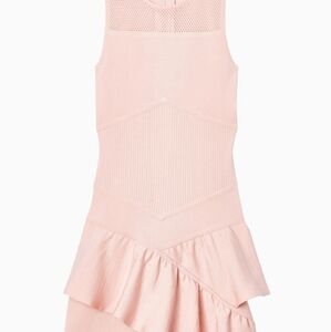 I was Unable to find stock photos with the correct Color.The dress I have is Ivory. The Paulette Knit Dress plays with texture. A hint of skin peeks through at the yoke while vertical ribbing at the waist and diagonal ruffles at the skirt create an elongating effect on this stunner. Back zip closure.