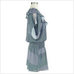 DETAILS: The Luisa Dress showcases a geometric print cast in cool blue and green hues. The graphic motif is softened by a flowing silhouette with draped open-slit sleeves, ruffle trim down the bodice and a smocked waistline. Pullover style.
