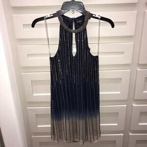 Parker paints a gradient-glam picture with an ombré silk dress marked by high-shine beads in chevron and vertical lines.
