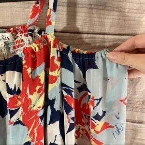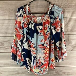 In excellent used condition no rips, tears or stains. A multi colored floral printed blouse, long bell sleeves with ruffle tiered cuffs, square neckline, cold shoulder detail, smocking detail in the back neck and non adjustable straps.