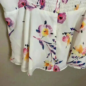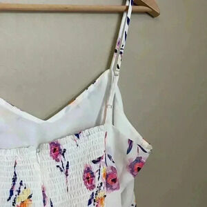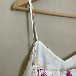 Features: adjustable straps, smocked back, zipper closure on back, flowy detail, bow on front, floral print