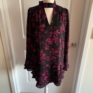 Parker Midnight Fleur Floral Mini Dress Midnight Fleur (Black Purple) Small Long Sleeve Double Button Neck Closure Lined Cutout Girly Feminine Party Girls Night Out Dinner Date Night