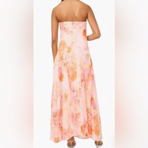 Elegant strapless maxi dress with a floral pattern. Features shades of pink and orange. Worn once for a wedding, perfect condition/no alterations. Has been dry cleaned!