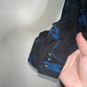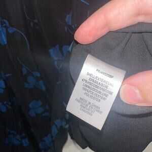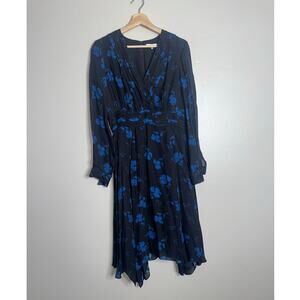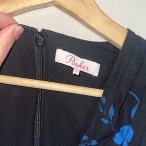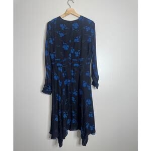 Keywords: Parker Dress, Fulton Stems, Silk Blend Dress, Long Sleeve Dress, Black Blue Floral, V-Neck Dress, Asymmetrical Hem, Cocktail Dress, Evening Wear, Elegant Dress, Designer Dress, Medium