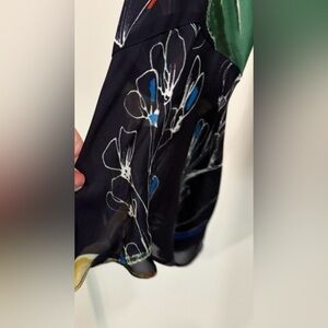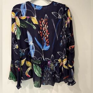 Parker Gardenia Nights Navy Floral silk blend blouse ruffle peplum detailing