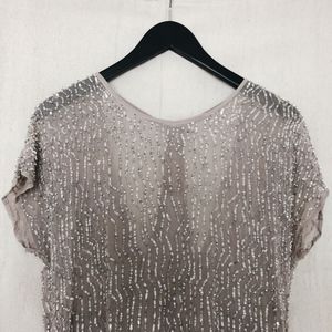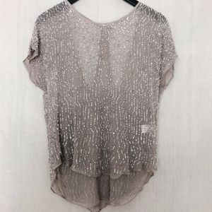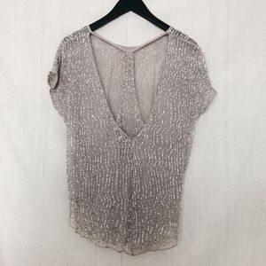 •Features: Sheer but double-layered top by Parker. Has cool sequin design and a sequin halter back underlay detail. Worn ONCE. The perfect top to wear with white jeans in the summer or throw on with black leather in the winter.