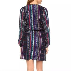 Parker Hedra Hammock Colorful Navy Blue Silk Geometric Long Balloon Sleeve Dress Medium in excellent condition, no flaws. Latter embroidered details and elastic waist