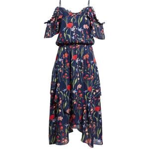 Beautiful! Vibrant blossoms bring an air of spring to this silk dress gathered with an elastic waist and punctuated with shoulder-baring cutouts. Excellent pre-owned condition! Offers welcome. True to size XS=2 Color: Gardenia Night Slips on over head V-neck Short flowy sleeves with cold-shoulder cutouts Elastic waist Shark-bite hem Partially lined 100% silk Measurements approximate, taken with item laying flat: underarm to underarm 18" (36"), waist unstretched 12" (24"), length top hem to bottom hem 45"