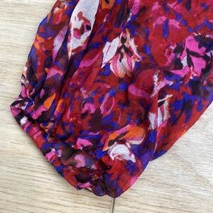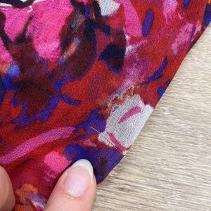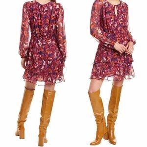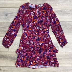 Sheer silk long sleeve abstract floral layered mini dress by Parker. The vibrant pattern in pink, red, orange and blue has a fun confetti 70’s vibe that contrasts beautifully with the polished look of the sheer bishop sleeves and the split round neckline. Features a fitted top that’s cinched at the natural waist. The skirt features two large layered ruffles for a flirty finish. A great party dress that easily translates from day to night. Two very minor runs as pictured, largely hidden in the pattern. Overall In excellent condition, Size 0