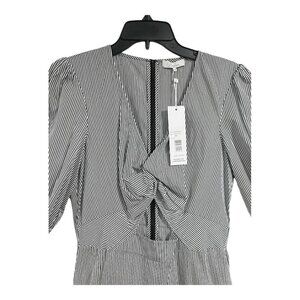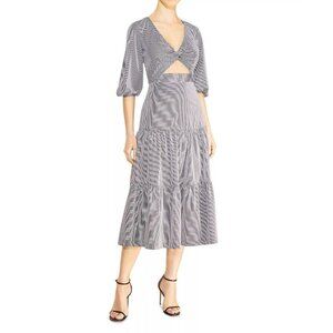 Tiered midi design with a daring cutout at the bodice balanced with romantic blouson sleeves.