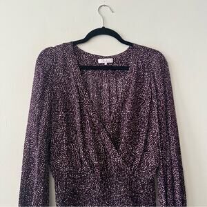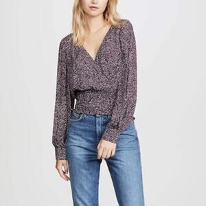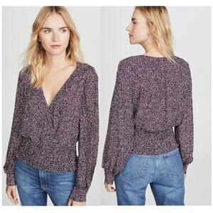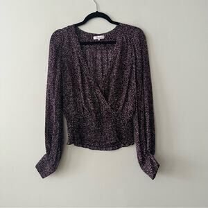 Silk fabric. Faux-wrap, surplice style neckline. Smocked waistband. Cuffs have covered buttons on them. In good preowned condition. Has a snap closure so you can secure the neckline.