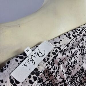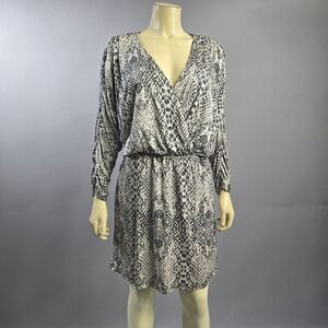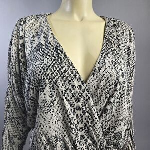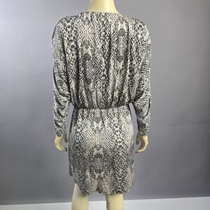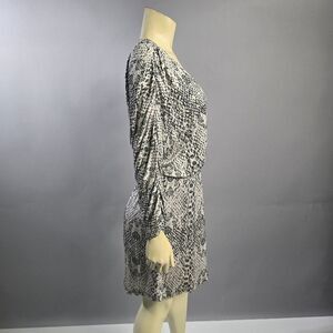 Stylish dress with a black and white pattern. Features a V-neck and long sleeves. Perfect for any occasion.