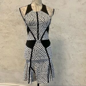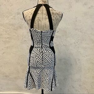 Parker Neve Fit & Flare Dress in Black & White features a small scoop neckline, geometric pattern throughout, a cut out back and concealed back zipper. Stretch fabric. This figure flaunting knit creates the perfect silhouette! Partially lined. Size XS. Never worn and in excellent condition. NWOT. *See photos for approximate measurements laying flat.