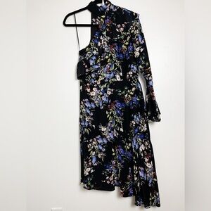 Parker One Sleeve Silk Black Asymmetric Ruffle Dress 6 Dark Floral Flounce
