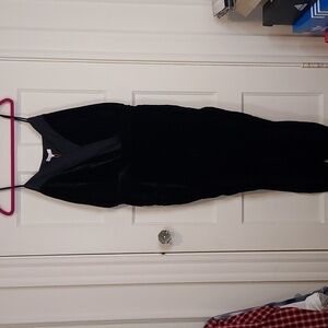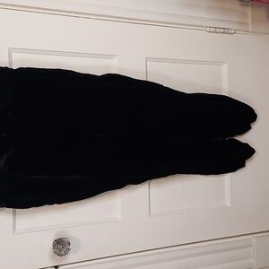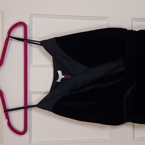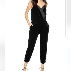 This plush velvet jumpsuit features a faux wrap style, cami top trimmed with satin detailing along the neckline. Adjustable straps, an elastic waist, and gathered cuffs make it an easy choice for a bit of holiday glamour.