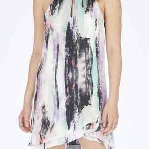 Priscilla sleeveless multicolored crew/high neck abstract printed silk crepe mini shift. A-line silhouette dress in marbella. Double crew/halter/high round neckline (front and back) all over aqua, black, blush, purple, and white abstract print, cutaway (cut-in) shoulders at slim-fit bodice, silk fabric construction throughout, front slim neckline cutout keyhole slit, nonadjustable halter-style slender spaghetti straps, modified racerback, flowy, slightly flared, and three-tiered subtle layered ruffles at front and back A-line skirt, slim keyhole opening at back with concealed single button closure, relaxed silhouette/draped fit, lined, and straight