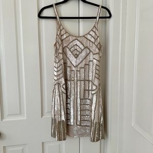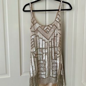 Size XS. Beautiful white, sequin mini dress. Perfect for your reception / after party dancing, a bachelorette night out, a honeymoon date night outfit, or a festive outfit for the night before the big day :)