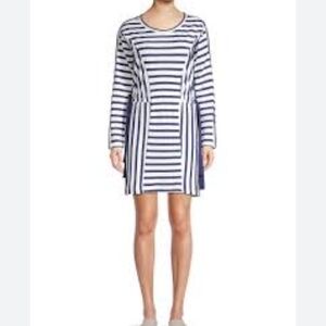 This relaxed dress sports allover stripes that are juxtaposed to create an eye-catching pattern.
