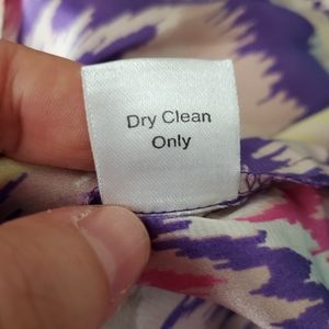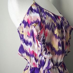 Colorful print silk dress with racerback and ruffle detail on the sides. Unlined, elastic waistband, pull-on style.