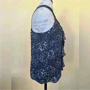 Parker- Cascading Ruffle Sleeveless Animal Print Top Animal Print= Blue, Black, White, And Gray Print 100% Silk