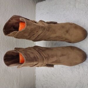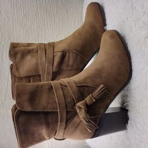 Parker & Sky Women's Brown Suede Dual Ankle Strap Tassel Detail Upper Almond Toe Slip On High Stacked Heel Mid Calf Boots. Man Made Sole. Microfiber Lining. Light Cushioned Footbed. Upper Suede Tassel Spot. Heel Scuff. Light Sole Wear. Measurement approx. Heel: 3 3/4". Size 10 Color May Vary Due To Lighting.