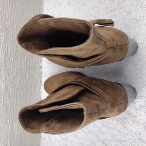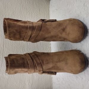 Parker & Sky Brown Suede Dual Ankle Strap Almond Toe Stacked Heel Mid Calf Boot