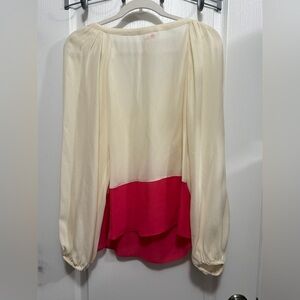 This Parker blouse for women in size XS features a chic colorblock design in cream and pink, perfect for a bohemian or fairy-inspired look. Made of 100% silk chiffon, it has a V-neckline with a tie closure and elegant balloon sleeves. The lightweight and breathable fabric make it ideal for both casual and workwear occasions. This blouse exudes a delicate and dainty vibe, adding a touch of whimsical charm to any outfit.