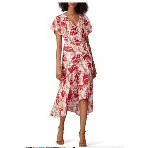 Romantic and feminine in silky floral-printed ruffles, this short sleeve Parker dress is ready for drinks after work.