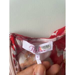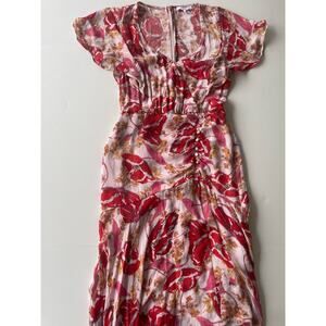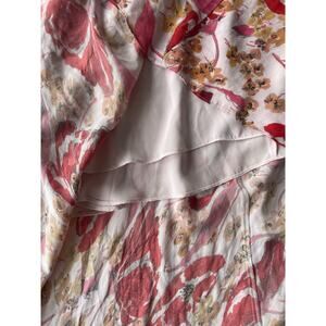 White and pink floral printed silk (100% Silk). Hourglass. Short sleeves. V-neckline. Hidden back zipper with hook-and-eye closure. Partially lined.
