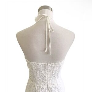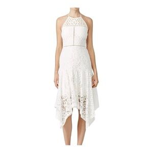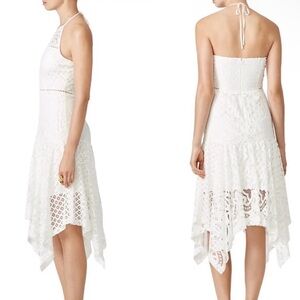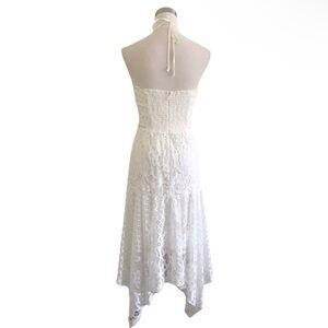 This stunning white sundress by Parker features a sleeveless halter neckline and an asymmetrical tiered hem, perfect for a bridal or wedding guest occasion. The dress combines a fitted bodice with delicate lace detailing, creating an elegant and airy silhouette.