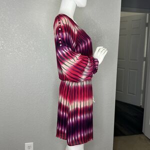 This colorful Parker dress is perfect for any occasion, from weddings to casual outings. The dress features a surplice V-neckline and long sleeves with button accents along shoulders. It is made of silk with a striped pattern. The dress has a blouson style. It is a short dress with a pullover closure