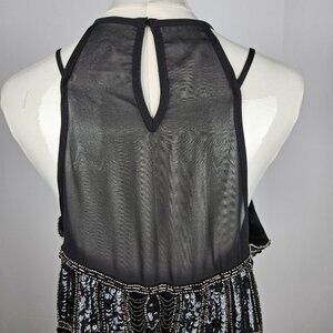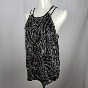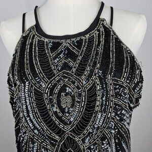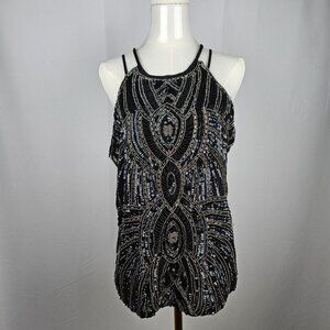 Parker Zane Fully Beaded Black Gold Sequin Silk Halter Tank Top Large