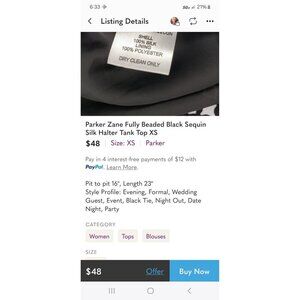 This Parker Zane silk luxurious halter tank top showcases intricate beading and sequins, making it a sophisticated choice for formal events. Its high-quality silk and polyester blend ensures comfort and durability. The black color is versatile, easily pairing with various outfit choices for an elegant look.