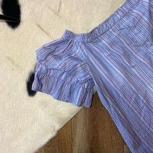 The top features an off-the-shoulder neckline and short sleeves with ruffle detailing. It is often described as comfortable and stylish, suitable for casual wear. Open to offers and bundle items to save!