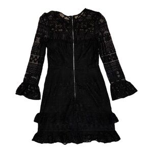Black dress with black lace overlay. Exposed zipper in the back and long sleeves with a slight bell. New with tags