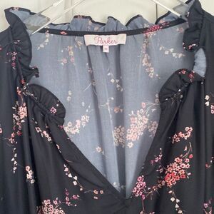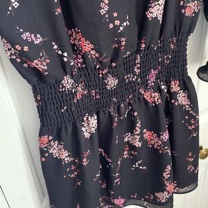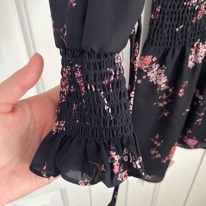 Excellent preowned condition. No rips or stains. Long sleeves. Elastic waist. Floral pattern. V neck. Tie cuffs. Unlined. Ruffle hem.