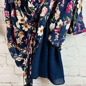 Parker Silk Blend Navy Floral Long Trumpet Sleeve Waist Tie Dress