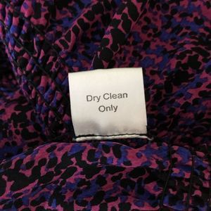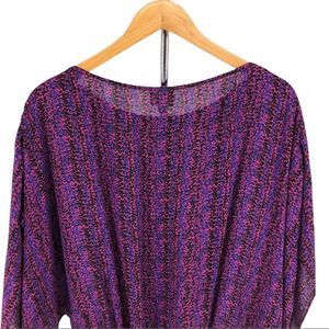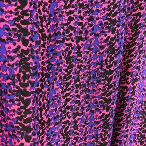 Gorgeous print, purple and black on a hot pink background, soft silk fabrication, smocked at low waist, comes up higher at sides, batwing sleeves.