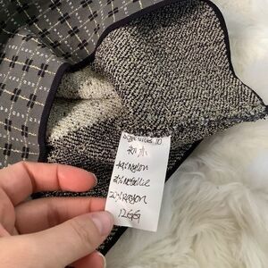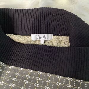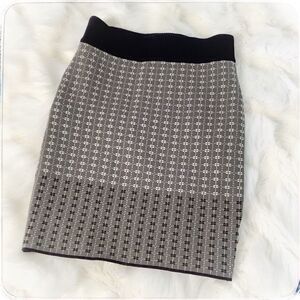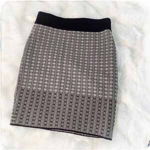Chic pencil skirt by Parker. Features fun subtle geometric design accented by gold shimmering thread. This is sample, has hand written material tag. Tons of stretch and contrasting waist. Great preowned condition. Lying flat waist approx 12.5” across and top of waist to bottom hem approx 17”. All measurements are approximate