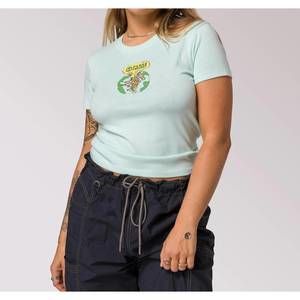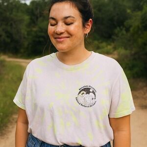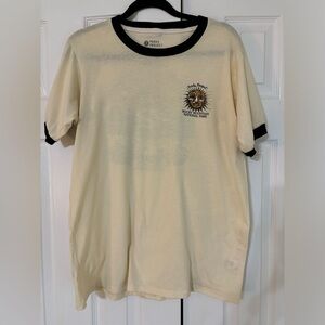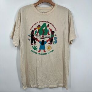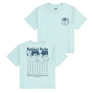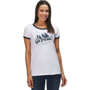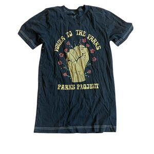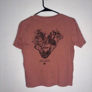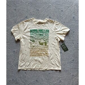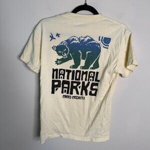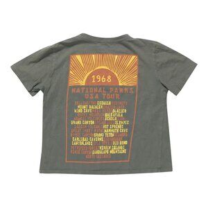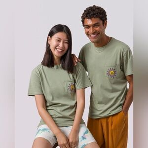 Short sleeve tee by Parks Project. Olive green with orange logo on chest. Comfortable and casual style.